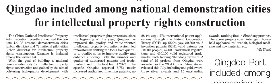 Sister-city Flash News|Qingdao included among national demonstration cities for intellectual property rights construction