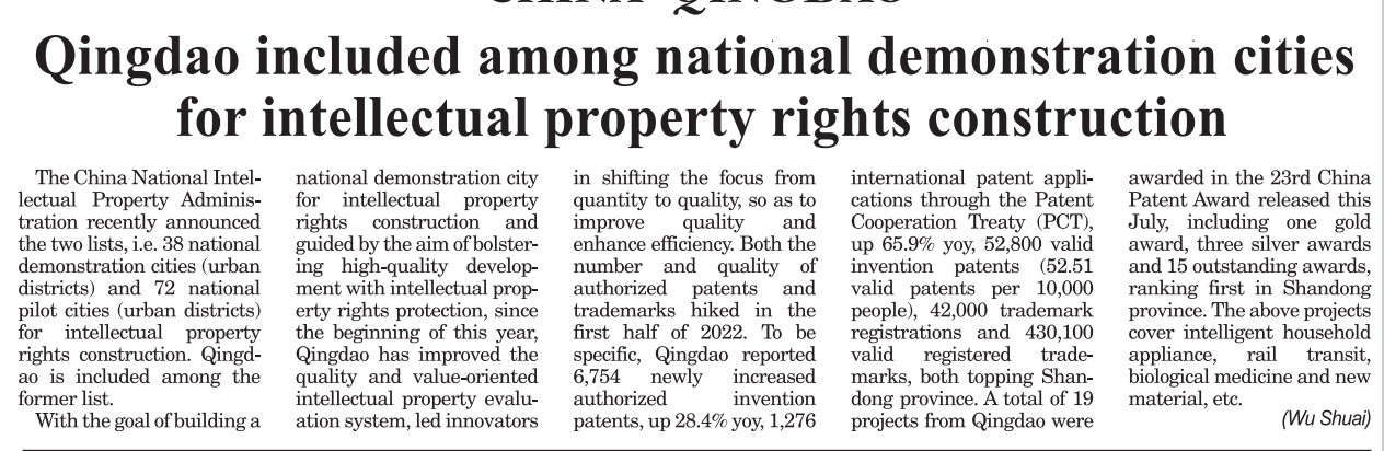 Sister-city Flash News|Qingdao included among national demonstration cities for intellectual property rights construction